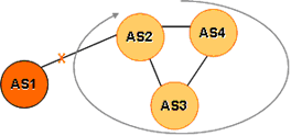 By replacing the path cost counter with a fully enumerate AS sequence this form of loop can be averted. Continuing the example in Figure 2, when AS2 withdraws its route to AS3 and AS4, AS4 will still select the other route it has heard, but this time the selected prefix will have the path (3, 2, 1). When AS4 attempts to pass this advertisement to AS2, AS2 will see its own value in the associated AS Path and reject the advertisement. At the same time AS3 will withdraw its advertisement to AS4, and at that point the prefix will be dropped from the entire routing system.