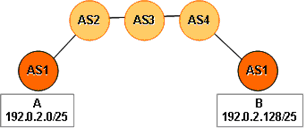 AS1 (A) advertises the prefix 192.0.2.0/25 to AS2, and this advertisement is propagated to AS2, AS3 and AS4. When AS4 passes this advertisement to the other segment of AS1 (B), this router will reject the advertisement because the associated AS path (4,3,2,1) indicates that the route has already passed through AS1. Similarly, the first segment of AS1 (A), will reject the advertisement of 192.0.2.128/25 from AS2, as its path (4,3,2,1) also indicates that a loop has formed. To restore complete connectivity between the distinct parts of AS1, AS1 needs to configure static routes at its edges. If AS1 (A) configures a static route to 192.0.2.128/25 pointing towards AS2, and AS1 (B) similarly configures a route to 192.0.2.0/25 via AS4, then the configuration enables full connectivity.