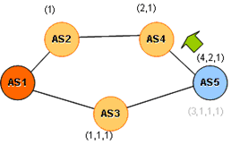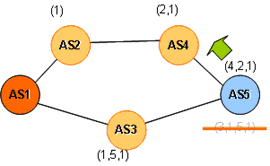 The AS Path is used as a path metric in BGP’s path selection algorithm. The default route selection metric in BGP is that of selection of the minimal length AS Path, with each AS in the path counting as a single unit of ‘cost’.  When a BGP speaker receives two or more advertisements for the same address prefix, the default selection mechanism is to prefer the advertisement with the minimal AS Path length. In the case of the example network in Figure 1, AS 5 will prefer to use the path via AS3 to reach the originating AS1, in preference to the longer path of AS4 then AS2.