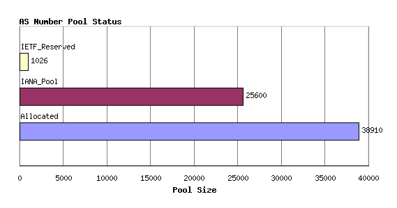 As of July 2005 the IANA is holding 25,600 numbers, while 38,910 numbers have been allocated to the RIRs. The overall picture of the AS number space is shown in Figure 1.