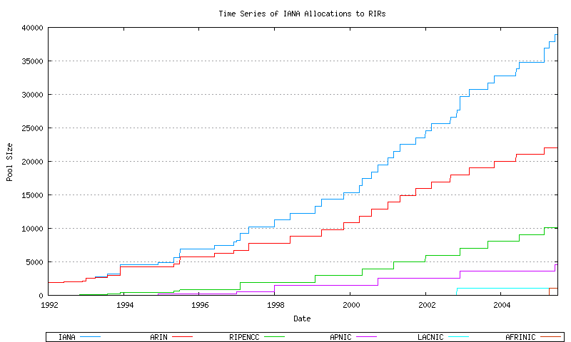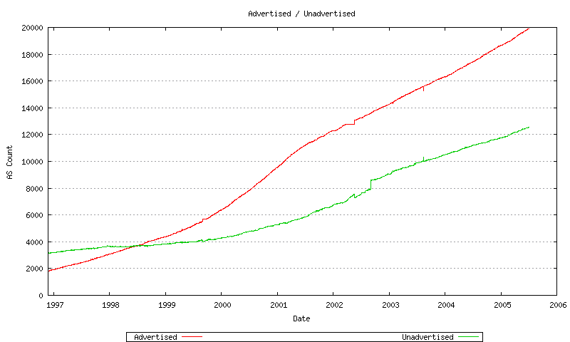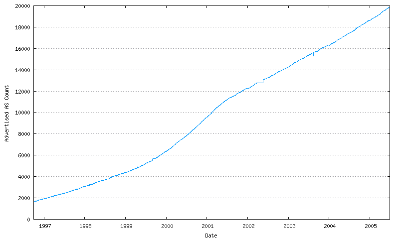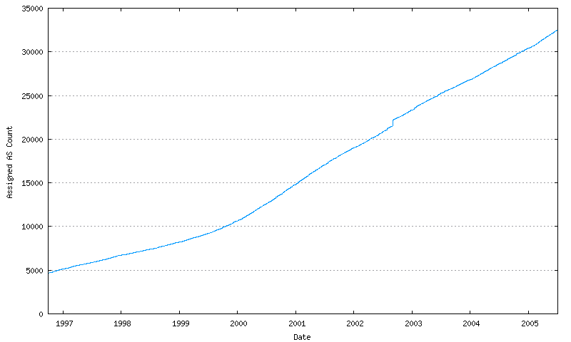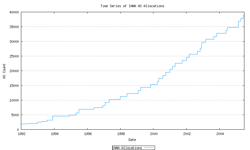 Of the 64,510 available AS numbers, as of July 2005 we have already allocated some 39,000 AS numbers, or well over half of the number pool. This raises two immediate questions – how long before the number pool is completely exhausted, and what are our options for a expanded number pool that can encompass a larger inter-domain routing environment?