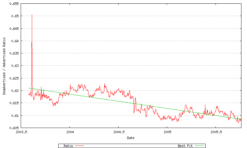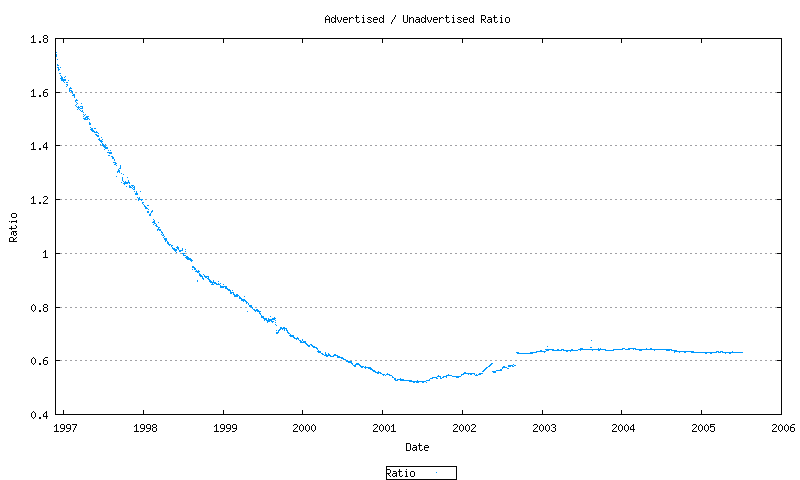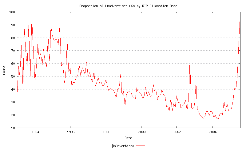 Again, this can be further broken down to each RIR, as shown in Figure 4. It is evident from this view that the ratio of unadvertised to advertised AS’s varies across the RIR system. The highest ratio is in the ARIN region, which also coincides with the earliest allocations. There appears to be some relationship between the probability of an AS being visible in the routing system and the allocation lifetime of an AS.