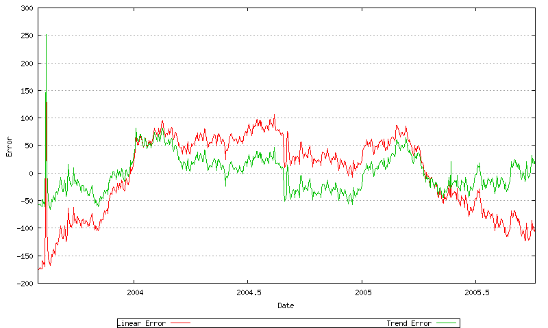 The error between the original data series and the linear and exponential trend models is shown below. The closer the values in these series are to zero, the better the fit.