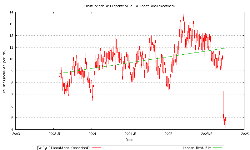 These allocated AS’s are then assigned to ISPs by the RIRs, and a second time series can be generated, showing the rate of AS assignment to ISPs and Local Internet Registries. This allocation time series is shown in Figure 7. Again the series shows the effects of the Internet boom across the period from 1999 through to late 2001. The subsequent market correction is also evident, which was visible in the AS allocation rate change by early 2002.
