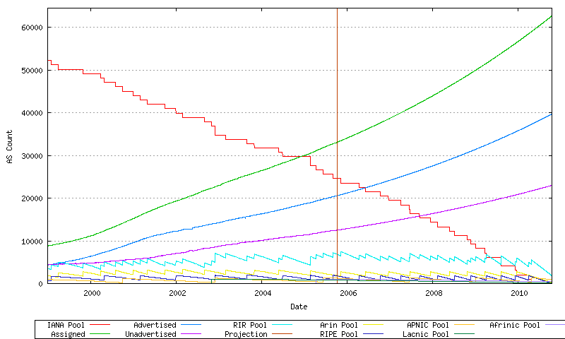Using this model of each RIR’s relative rate of allocation, it is possible to generate a model of AS number consumption. Here the end point is the date where the first RIR has exhausted its available pool of 2-byte AS numbers, and no further numbers are available in the IANA unallocated pool to replenish the RIR's pool. The data available suggests a best fit predictive model where this will occur on October 2010.