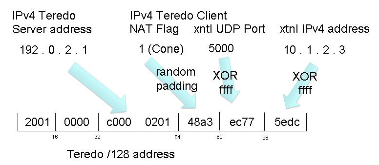 The Teredo Router Advertisement packets include an Origin Indication field, which contains the NAT-mapped external IP address and UDP port number of the Teredo client. This information is used to construct the client's Teredo IPv6 address. Like 6to4, Teredo uses its own address prefix, and all Teredo addresses share a common IPv6 /32 address prefix, namely 2002:0000::/32. The next 32 bits are the IPv4 address of the Teredo server. This implies that all Teredo clients of the same Teredo server share a common IPv6 /64 address prefix. The IPv6 interface identifier field is used to support NAT traversal and it is encoded with the triplet of a field describing the NAT type, the relay's view of the UDP port number used to reach the client (the external UDP port number used by the NAT binding for the client) and the relay's view of the IPv4 address used to reach the client (the external IPv4 address used by the NAT binding for the client). The NAT type field is padded with a random pattern, and the port and IP address fields are XOR'ed with all 1's to prevent gratuitous NAT translation of IPv4 addresses detected in the IP packet payload.
