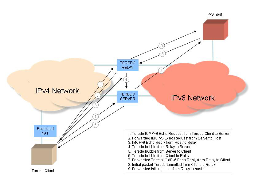 For a Teredo client to communicate with an IPv6 host there are a number of cases: The host is a Teredo Client behind the same NAT, the host is a Teredo client behind a different NAT, the host is a Teredo client behind a teredo host-specific relay, of the host is not teredo client nor a Teredo host-specific relay, and from a teredo perspective, is therefore an IPv6 only host. In the case of Cone NATted Teredo clients communication with other Teredo clients can happen via direct exchange. In other cases an initial packet exchange between the teredo Client and its Teredo Server is used to establish whether a teredo Relay should be used, and whether additional NAT binding state should be set up. For example, if the remote host is an IPv6 only host, the Teredo client will initially send an ICMPV6 Echo Request packet via its Teredo Server, which will be forwarded onto the IPv6 host. The host's IMCPv6 response will be directed to the Teredo Client, but will arrive at the closest Teredo Relay to the IPv6 host. If the Teredo Client's NAT is a Cone NAT then the Relay will direct the IMCP echo Reply to the Teredo client, who will then set up a local binding of the IPv6 address with the Teredo Relay's IPv4 address and UDP port and complete the initialization of the communication state. If the Teredo Client's NAT is a Restricted NAT then the Teredo Relay will send a bubble packet to the Teredo Server, who will direct the packet to the Client with an Origin indication of the Teredo Relay. The Client will then forward the packet to the Teredo Relay, opening up a NAT binding for the Relay. The Relay will then forward the ICMPV6 Echo Reply to the Client. Receipt of the ICMPv6 Echo Reply will then complete the initialization of the communication state.
