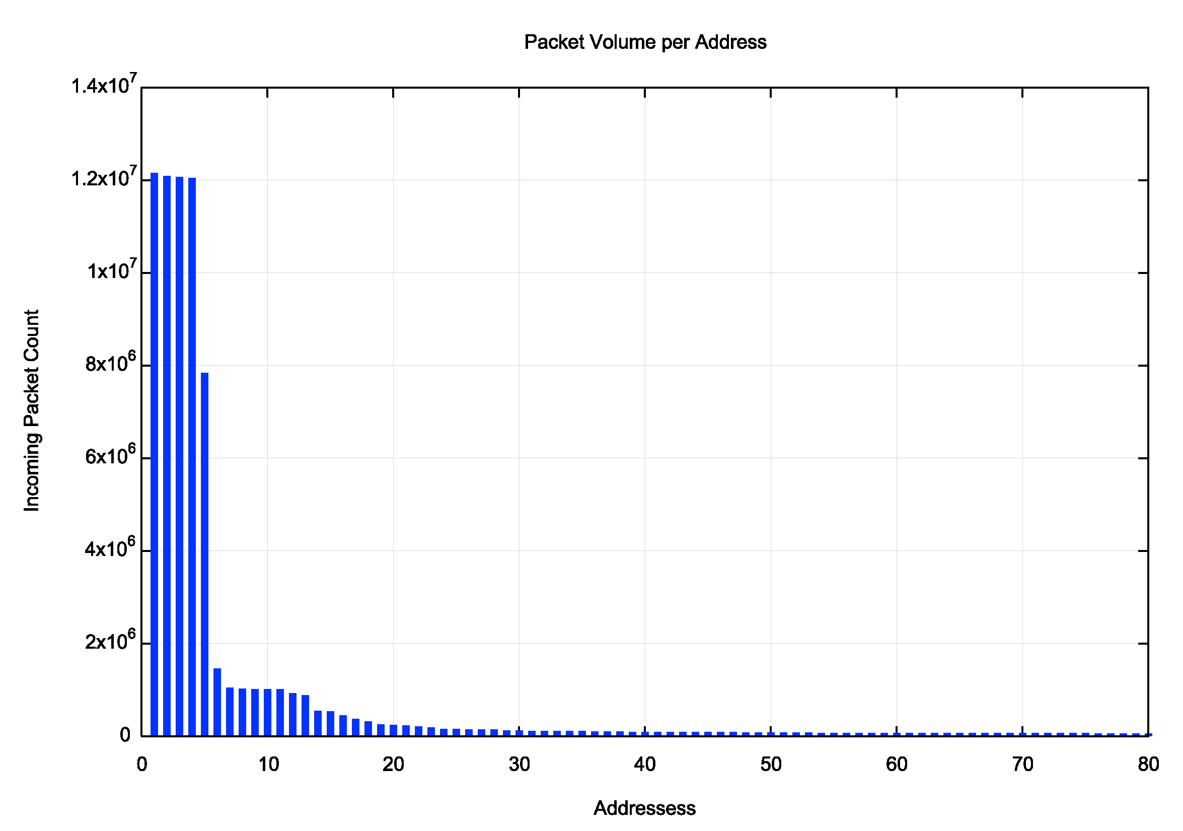 The packet volumes of the top 80 individual addresses are shown in Figure 9. It is evident that five addresses have received a significant volume of traffic, and a further twenty addresses have received more than the average traffic share. After that the traffic per address appears to even out (Figure 10).