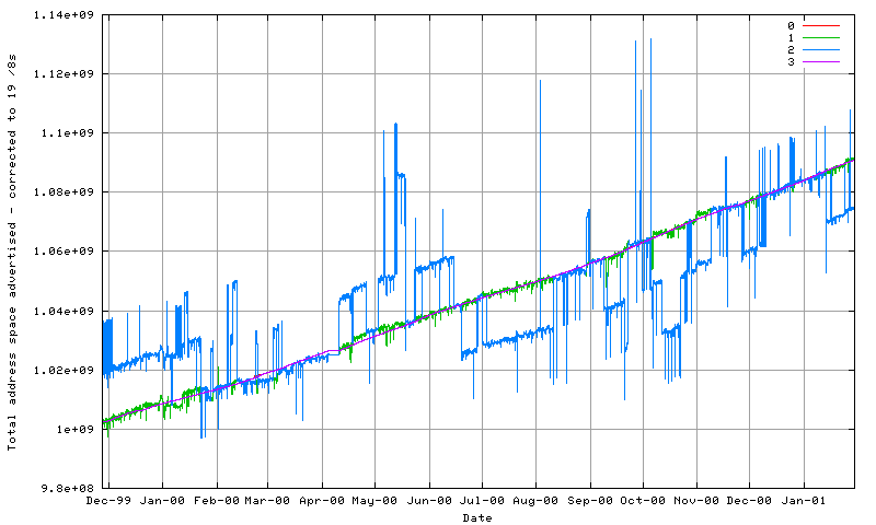 It is also possible to track the total amount of address space advertised within the BGP routing table. At the start of 2001 the routing table encompassed 1,081,131,733 addresses, or some 25.17% of the total IPv4 address space, or 25.4% of the useable unicast public address space. By September 2001 this has growth to 1,123,124,472 addresses, or some 26% of the IPv4 address space. This has grown from 1,019,484,655 addresses in November 1999. However, there are a number of /8 prefixes that are periodically announced and withdrawn from the BGP table, and if the effects of these prefixes is removed, a compound growth model against the previous 12 months of data of this metric yields a best fit model of growth of 7% per year in the total number of addresses spanned by the routing table.
