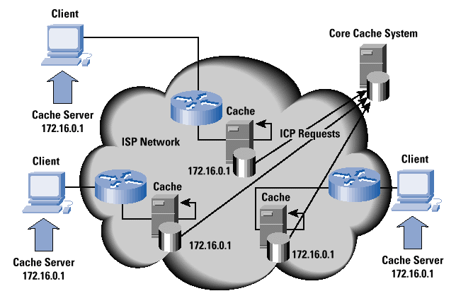 Single Web proxy cache systems can be placed under some significant load, and an overloaded and poorly performing cache is perhaps worse than no cache at all. However, scaling this deployment model can prove challenging. Where an ISP operates multiple access points, or points of presence (POPs), one scaling solution is to deploy a server at each POP and use the same IP address for each server. This solution allows the ISP to provide a consistent configuration to all clients and to augment capacity at any location seamlessly. If the cache itself is responsible for advertising the common IP address into the routing system, the caches can also act in a mutual backup role. Failure of a single server will shut down the local route advertisement. Traffic directed to this address will then be carried by the routing system to the next closest proxy cache. There may be some level of TCP session resets for sessions that were active on the failed unit, but in all other respects the switchover is seamless to the client base, and the recovery of an operational state among a set of such servers can be left to the routing system. This deployment model is indicated in Figure 5. Such servers can be configured as a set of local satellite systems to a larger caching core, using an Internet Cache Protocol (ICP) configuration to set up a caching hierarchy.